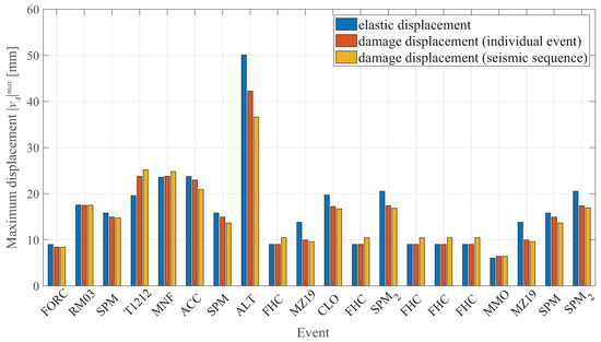 Finally, Figure 22 gives a direct comparison between the maximum values attained by the displacement for all analyzed events, where the blue and red bars refer to the elastic and damaged cases, respectively.