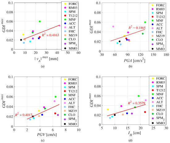To further investigation, Figure 23 shows the correlations, in terms of regression lines depicted in red, between the maximum Global Damage Index evaluated for each event with (a) maximum response displacement , (b) , (c) , and (d) Housner intensity . It appears that the quite well correlates with the Housner intensity, both indexes being evaluated as average quantities. Even more satisfying is the agreement obtained with and , as opposed to , which shows the lowest level of correlation.