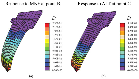 An interesting feature is highlighted in Figure 23a: although the general trend is that the higher the maximum displacement, the higher the , this is not always true, i.e., an increase of the maximum achieved displacement in some cases corresponds to a decrease of damage. For instance, the highest value of is obtained for MNF, in spite of the highest value of corresponding to the ALT record. This is due to the deformed configuration assumed by the structure during the loading history, that influences the areas where maximum tensile strains and, consequently, damage occur. Thus, the pier top displacement could be not sufficient alone to fully interpret the structural damage state. Focusing on the responses to MNF and ALT accelerograms, Figure 24a,b show the distribution of the damage variable D on the pier amplified deformed configurations referring to points B and C in Figure 13a and Figure 15a, respectively. It appears that ALT mainly activates mode 1 deformed shape (Figure 24b), whereas MNF seems to combine mode 1 and 2, inducing a more spread damage along the pier height (Figure 24a). Moreover, similar intensities of the maximum local damage D emerge, although these correspond to significantly different values of the pier top displacement, which is and for MNF and ALT, respectively.
