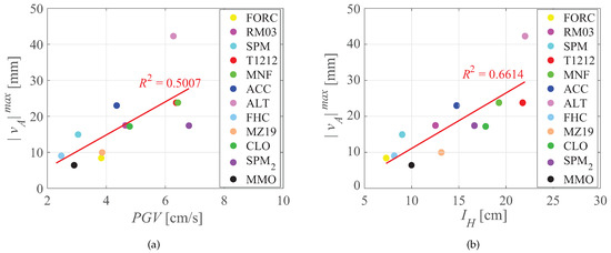 In Figure 25, other two correlations are shown: the first (Figure 25a) relates with maximum response displacement , and the second (Figure 25b) analyzes the relation between Housner intensity and . These are noteworthy in being characterized by high values of the correlation coefficients, unlike and quantities, that are almost unrelated.