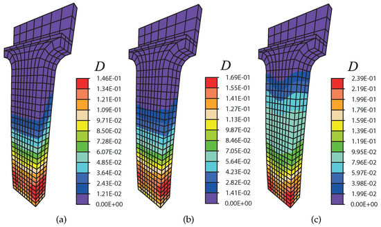 Distribution of the damage variable D on the pier undeformed configurations corresponding to points (a) B, (b) C, and (c) E in Figure 26c.