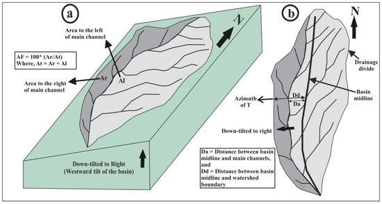 According to several studies carried out in the different parts of the world, AF and T have proven to be influential in determining active ground tilting [5,6,7,38,39,40,41,42,43]. Both AF and T indices assess the preferred lateral shifting of the trunk stream of a drainage basin to the basin margin or drainage divide (Figure 2a,b). It indicates that even a small lateral shifting with the tectonic tilt can facilitate incision and head-ward erosion of streams [44]. The tectonic tilting lengthens the up-tilted tributaries shifting the drainage divide in the up-tilt direction and pushing the trunk stream in the down-tilt direction due to increased sediment delivery and accumulation by tributaries of the up-tilted side of the basin [5].
