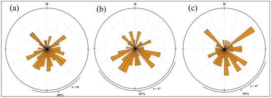 - Curray, J.R. The analysis of two-dimensional orientation data. J. Geol. 1956, 64, 117–131. [Google Scholar] [CrossRef]