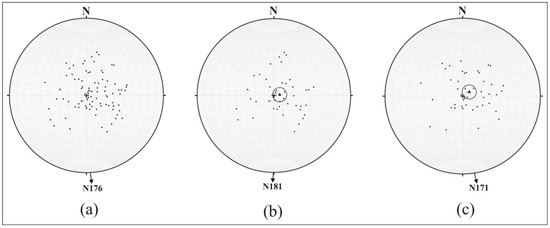Stereographic projections of the magnitude and azimuths of T for (a) Garhwal synform; (b) Northern limb of synform; and (c) Southern limb of synform. The polar plot of the all basin azimuth; mean azimuth of all three is shown as a small arrow; the mean of the polar plot (black shaded triangle enclosed within a circle) for northern and southern limb is shown in (b) and (c) respectively. At the center of all three polar plots, the magnitude = 0, and at margins, the magnitude = 1.
