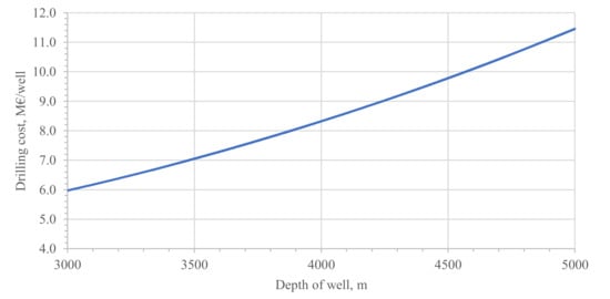 - —cost of drilling. Dependencies of drilling costs from depth were acquired from several sources [,,,,], and the average values are plotted in Figure 1 and were taken for the calculations.
