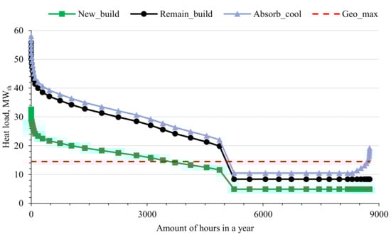 Figure 2 illustrates the expected heat load of the campus when its reconstruction is finished. The design heat load of the to-be-built buildings and the remaining existing buildings is estimated at 32.6 and 23.2 MWth, respectively, while the heat load of absorption chillers can reach up to 10.7 MWth in summer. Thus, the influence of the to-be-built buildings on the future heat and cold supply of the campus might be quite high. The heat demand of the campus in summer is, in many scenarios, lower than potential heat production. That is why practically achievable EGS heat generation is lower than the potential one. The red dashed line in Figure 2 displays the estimated maximum geothermal output, and in this case, the load factor is 88%, while other values of the output lead to higher load factors. The average distribution of geothermal energy between the heat demand of the to-be-built buildings, remaining existing buildings, and absorption cooling machines is 91%, 7% and 2%, respectively.