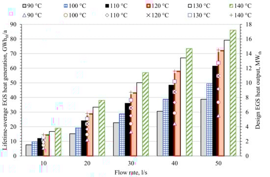 Lifetime-average EGS heat generation (columns) and design EGS heat output (symbols) for the reference case.