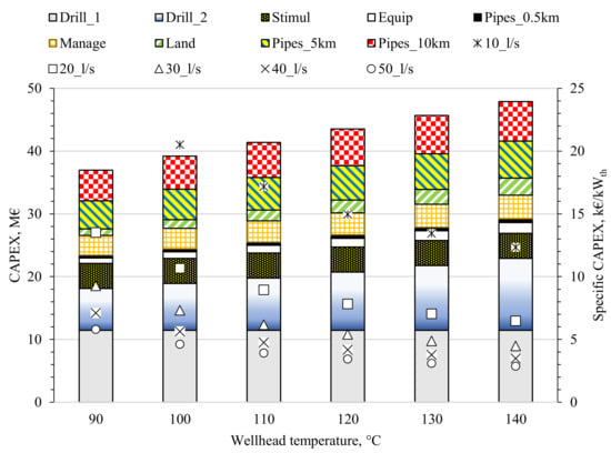 Capital expenditures for the reference case conditions along with 0.5 km, 5 km and 10 km scenarios are shown in Figure 4. Costs of drilling and stimulation of two wells represent from 56 to 86% of CAPEX, and the next costly items are the costs of pipelines and the cost of project management. It is worth noting that components “Land”, “Pipes_5 km” and “Pipes_10 km” are applicable only for 5 km and 10 km scenarios. Since drilling-related costs form the biggest part of the CAPEX, the components of CAPEX are presented in the chart only in dependence to the wellhead temperature, which is directly related to the drilling depth, and the influence of fluid flow rate on the total CAPEX is relatively small. In the same chart, specific CAPEX for different flow rates in the reference case are shown. The smallest values correspond to the highest considered flow rate (50 l/s); they vary from 5.8 to 2.9 k€/kWth for the temperatures from 90 to 140 °C. At the same time, the values for 10 l/s vary from 26.1 to 12.3 k€/kWth.