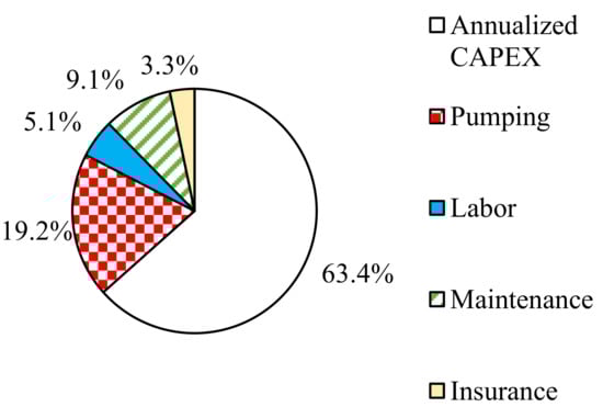 - —cost of submersible pumps; derived from Ref. [] using Producer Price Index (PPI) equal to 1.6 [] (exchange rate in November 2020: 1 USD = 0.85 EUR). The pumps are to be replaced every 5 years.