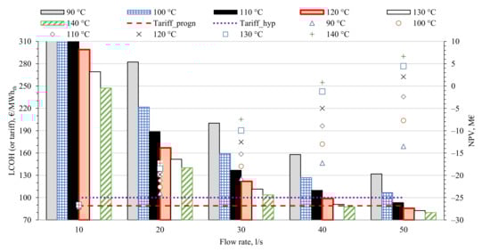 LCOH (columns), prognosed heat tariff for the campus (dashed line), hypothetic heat tariff for the campus if CO2 tax is 100 €/t (dotted line), and NPV (symbols) for the reference case. Note: the values of LCOH for 90 °C, 100 °C and 110 °C under 10 l/s are 525, 406 and 342 €/MWhth, respectively.