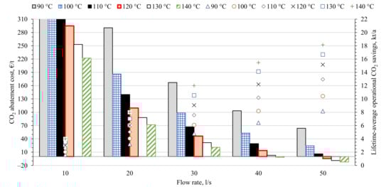 Even though many scenarios are not economically beneficial, their ecological effect is an important factor to consider. CO2 abatement cost and lifetime-average operational CO2 savings for the reference case are presented in Figure 7. The CO2 savings vary from 1.6 to 18.1 kt/a (3–34% of the emissions from the fossil-fuel based heat supply system of the remaining existing buildings, new buildings and absorption chillers) and the CO2 abatement costs—from −12 to 655 €/t. The highest parameters of the brine yield the best results, as it was demonstrated for LCOH and NPV. The high-temperature scenarios with brine flow rates of 30 l/s present quite acceptable CO2 abatement costs, which range from 21 to 31 €/t.