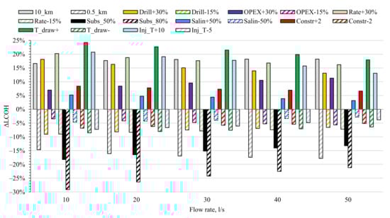 It can be noted that, in general, factors influencing LCOH have less effect on higher flow rate scenarios which can be explained by larger amount of produced heat by EGS, thus smoothing the fluctuations. The exceptions are “Distance” and “OPEX” parameters showing the opposite trend since they are both proportionally and strongly related to the amount of produced heat.