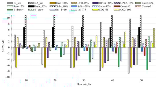Parameters “Distance” and “Drilling cost” are very influential on unfavorable deviations of NPV. If the distance from the field to the campus is increased from 5 to 10 km, NPV decreases by 4.3–8.7 M€ for the scenarios with flow rates from 10 to 50 l/s. Increasing drilling cost by 30% leads to NPV decrease by 6.7 M€. Temperature drawdown is also a parameter worth noting, especially for high flow rates, since it can worsen NPV value by up to 7.6 M€. Other parameters—OPEX, nominal discount rate and injection temperature—have some impact on NPV, and the remaining parameters have a relatively minor one.