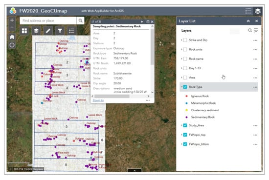 Finally, the web map application was completed and ready to be published online with a uniform resource locator (URL) link. Additionally, anyone with the link could view and query the result data in real time. Thus, students could easily view and share their own data on ArcGIS Online with their classmates and teachers at the geological sites during and after the fieldwork for discussions (Figure 3 and Figure 4).