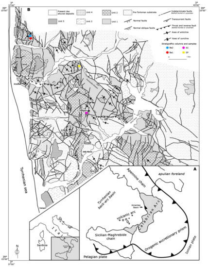(A) Location of the Amantea Basin within the southern Tyrrhenian–Calabrian Arc system and Italy (inset). (B) Geological map of the central–northern portion of the Amantea Basin in which the stratigraphic columns and relative sample sites of Figure 2B are indicated (Be—Belmonte; SP—San Pietro; SC—Santa Caterina). The depositional units refer to in [17]. Unit 1 corresponds to the depositional sequence DS1 of Figure 2A. Units 2 and 3 correspond to the depositional sequence DS2 of Figure 2A. Unit 4 corresponds to the sequence DS3 of Figure 2A. For lithological units see Figure 2A. Modified after [17].