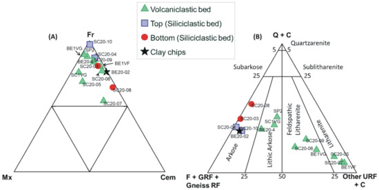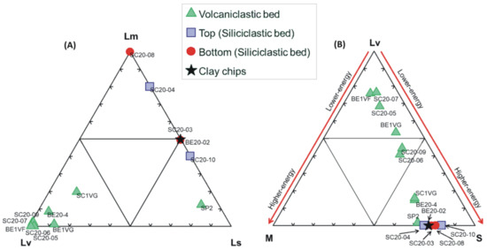 The studied samples showed considerable variation in composition and they are scattered from the litharenite to the arkose fields of the triangular plot (Figure 3B). The distribution points highlight the source rocks’ combined volcano and metamorphic/sedimentary clastic supply plotted as LmLvLs diagram (Figure 4A). This diagram shows a sharp contrast in the composition of the volcaniclastic interval, almost exclusively composed of volcanic fragments, and the siliciclastic beds occurring at the bottom and top, where the volcanic component is completely absent. An exception is represented by samples BE20-04, SP2 and SC1VG, representing the coarser beds among the volcaniclastic interval (at a microscope scale of observation). The detrital framework modes document changes in the detrital assemblage of the volcaniclastic lithic fragments. All samples are characterized by a higher proportion of shards with respect to pumices showing a minor amount of altered glass (Appendix A, Table 1). Relative proportions of Lv:M:S (e.g., [62]) (Figure 4B) show a great dispersion with clustering of data as a function of sediment gravity flows and energy, with a composition becoming lithic-rich (volcanic) basinward and more “sialic” in the proximal facies. The intermediate composition of the two Santa Caterina samples could represent an intermediate composition. Accumulation of heavy detrital minerals (M pole) is most likely present in samples transported by higher energy processes. In Figure 4B, the samples represented by green triangles (volcaniclastic bed) could be related to different events which involved volcaniclastic material, whereas the other samples have not involved volcaniclastic material.