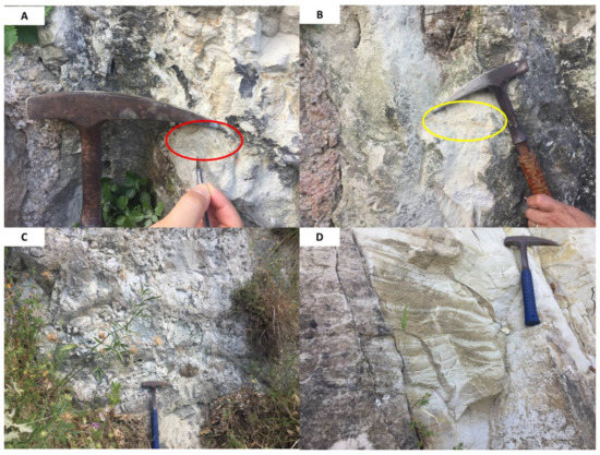 Volcaniclastic interval on the field: (A) red circle: interbedded coarser layers of predominant siliciclastic composition (BE-20-02); (B) yellow circle: oxidized interbedded coarser layers of predominant siliciclastic composition (BE-20-03); (C) rhythmic alternating coarse and fine beds of the volcaniclastic interval in Belmonte outcrops; (D) S. Caterina outcrop (SC-20-05, SC-20-07).