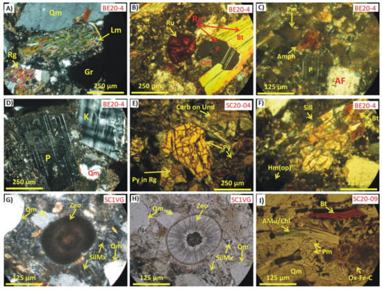 Photomicrographs from petrographic thin sections illustrating diagnostic grains of Santa Caterina (SC) and Belmonte (BE) outcrops. (A) Metamorphic fragments (Lm) with lepidoblastic texture. Rg: phaneritic granitic/gneissic rock fragment. Monocrystalline quartz (Qm) and garnet (Gr). (B) Coarse-grained granitic/gneissic rock fragments (Rg) including biotite (Bt), plagioclase and quartz (Qm). Ru: sub-rounded single crystal of rutile. (C) Cineritic layer with pumice grain (Pm), monocrystalline plagioclase (P) and brown amphibole (Amph). AF: Sericite replacement on undetermined feldspar. (D) P: single crystal of plagioclase supplied by granitic/gneissic source rocks. K: single crystal of K-feldspar (microcline). Qm: monocrystalline quartz. (E) Abundant monomineralic grains of pyroxene (Py) and few pyroxene in granitic/gneissic rock fragments (Py in in Rg). Carb on und: carbonate replacement on undetermined grain. (F) Sill: Sillimanite (fibrolite variety). Hm(op): opaque heavy mineral. Bt: Biotite. (G,H) Fan-shaped fibrous zeolite (Zeo). SilMx: siliciclastic matrix. Qm: monocrystalline quartz. (I) Biotite (Bt) and muscovite (Mu) flakes. AMu/Chl: chlorite replacement on muscovite. Qm: monocrystalline quartz. OX-Fe-C: Oxid-Fe cement. Pm: pumice. (A–G) are crossed-nicols photomicrographs; (H,I) are plane-polarized-light photomicrographs.