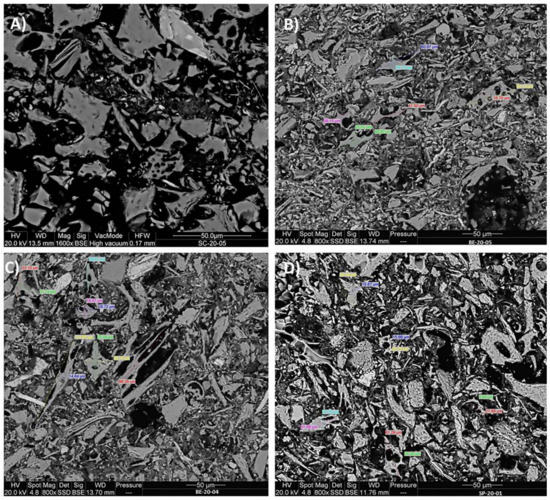 Micro-texture of volcanic glass fragments under SEM. (A) Shards and micro-pumices. (B) fine-grained volcaniclastic bed of BE outcrop (BE-20-05). (C) Coarse-grained volcaniclastic bed of BE outcrop (BE-20-04). (D) SP volcaniclastic bed (SP-20-01).