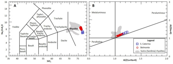 (A) TAS diagram [76] and (B) Shand’s index [77] of volcanic glass fragments of BE (red circle) and SC (blue square) outcrops, compared to Sardinian products of late Oligo-Miocenic volcanism of Sulcis area (grey area) [78,79].