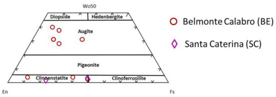 Minerals of volcaniclastic origin detected in the samples are represented by pyroxenes composed of both clino- and ortho-pyroxenes (Figure 10).