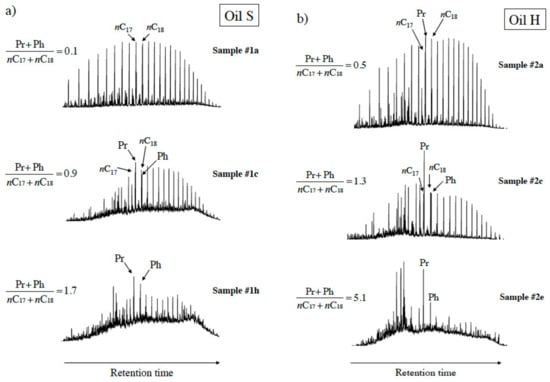 Total ion current traces of the saturate fraction from oils representing 3 stages of biodegradation of two sets of oil families (a) Oil S and (b) Oil H.