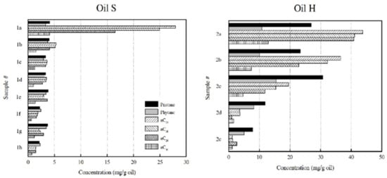 Concentrations of selected compounds (pristane, phytane, n-C17, n-C18, n-C24 and n-C30 alkanes) in the saturate fraction from oil samples analyzed in this study (Table S1). Calculations were performed based on areas in the m/z 85 mass chromatogram, with m/z 183 for squalane as an internal standard.