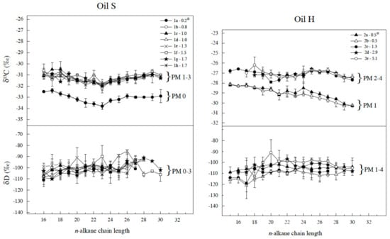 Carbon (based on V-PDB scale) and hydrogen (based on V-SMOW) isotopic composition of n-alkanes from Oils S and Oils H (Tables S2 and S3). * sample identification numbers and the ratio of pristane + phytane over nC17 + nC18 alkanes. The least biodegraded sample is characterized by the lowest (“lightest”) ratio. PM refers to biodegradation levels according to [11].