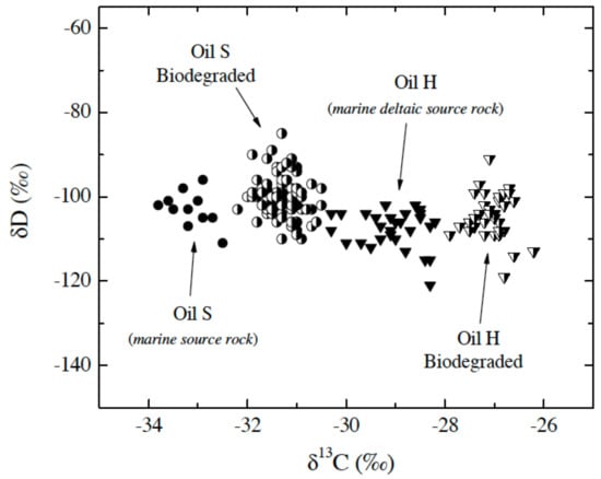 - Sun, Y.; Chen, Z.; Xu, S.; Cai, P. Stable carbon and hydrogen isotopic fractionation of individual n-alkanes accompanying biodegradation: Evidence from a group of progressively biodegraded oils. Org. Geochem. 2005, 36, 225–238. [Google Scholar] [CrossRef]