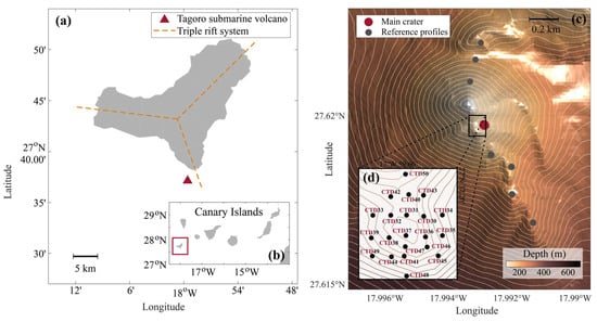 - Sotomayor-Garcia, A.; Rueda, J.L.; Sánchez-Guillamón, O.; Vázquez, J.T.; Palomino, D.; Fernández-Salas, L.M.; Lopez-Gonzalez, N.; González-Porto, M.; Urra, J.; Santana-Casiano, J.M.; et al. Geomorphic features, main habitats and associated biota on and around the newly formed Tagoro submarine volcano, Canary Islands. In GeoHab Atlas of Seafloor Geomorphic Features and Benthic Habitats; Elsevier: Amsterdam, The Netherlands, 2020; Volume 51, pp. 835–846. [Google Scholar] [CrossRef]