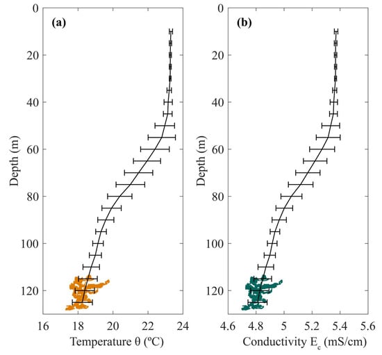 Mean vertical profile of (a) temperature, θ, and (b) conductivity, Ec, with their standard deviation used as a reference from outlying stations not affected by the submarine volcano emissions. The time series fluctuations measured around and over the main crater, in orange for temperature and dark green for conductivity, are located close to 127 m depth.