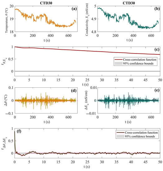 (a) Temperature, θ, and (b) conductivity, Ec, time series of CTD30 collected as part of the high-resolution grid. The similarity between both variable fluctuation patterns as well as the occasional distinct peaks is remarkable, and (c) their normalised cross-correlation coefficient rθ,Εc showing a strong correlation for short times (t < 3.5 s), which remains large even for long times. (d) The differentiation with respect to time of the temperature time series, Δθ, (e) the differentiation with respect to time of the conductivity time series, ΔEc, and (f) the normalised cross-correlation coefficient rΔθ,ΔEc of the differentiation with respect to time of temperature and conductivity time series going rapidly to zero, at the crossing point 0.6 s. In grey is indicated the 95% confidence bounds, where the time series are uncorrelated.