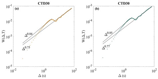 The variances of temperature and conductivity have been obtained as a function of lag time for all CTD time series. Figure 4 shows the variance of both temperature (Figure 4a) and conductivity (Figure 4b) of the CTD30 sampling point. Both properties present a quite similar scaling with a crossover point at Δ ≈ 3.5 s, defined as the time where the scaling exponent changes. The crossover point divides the time series into two time scales or regimes: the shorter time scale corresponds to the first regime and small lag times, and the longer time scale considers all the lag times and therefore, we will refer to it as the whole regime. We fitted each curve with Equation (1), W(Δ) = bΔγ, obtaining the early (small lag times) and the long-time (all lag times) behaviour for θ and Ec. For small lag times, , temperature and conductivity pose similar weak sub-normal behaviour, with scaling exponents 0.84 and 0.85, respectively. For the long-time behaviour, the whole lag times range has been considered. Again, both θ and Ec scale similarly, with values of exponents γ = 0.75 and γ = 0.77, respectively. For both small and large times, temperature and conductivity follow sub-normal behaviour, anti-persistent variations, which become stronger for longer times and lesser when scaling exponents. The absence of stationary behaviour (γ = 0) in temperature confirms the presence of a mechanism that causes the alterations (see also below), suggesting the existence of a remarkable hydrothermal vent field, consistent with what has been described so far in the area [,].