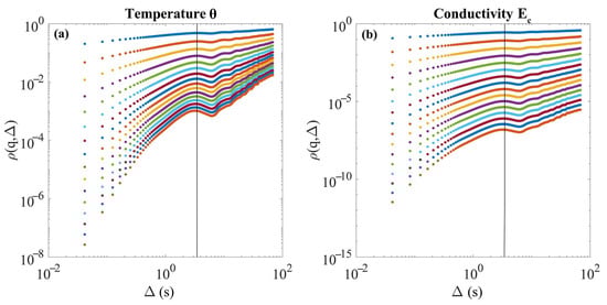 Generalised moments of CTD30 for (a) temperature, θ, and (b) conductivity, Ec, as function of the lag time, Δ, for different moment orders, , ranging from 0.25 to 4 with steps of 0.25. The line represents the turning point where the convex shape of the short lag times ends. Notice that Δ (s) refers to the unit of time in seconds.