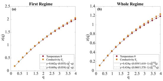 The structure function versus the order of the moment, , for (a) the first regime (short times) and (b) the whole regime (long times) for temperature, θ, and conductivity, Ec, time series and for the CTD30 data.