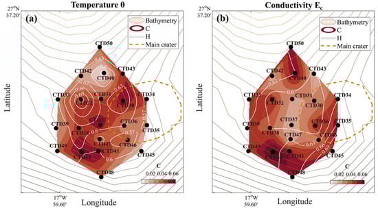High-resolution grid distribution of (a) temperature, θ, and (b) conductivity, Ec, measurements above of the main crater. The black dots indicate the position where the CTD time series were registered over the seafloor. The filled contours represent the C parameter, while the white contours show the values of the Hurst parameter. The main crater (dashed orange line) is located over the CTDs 30, 34, 35, and 36.