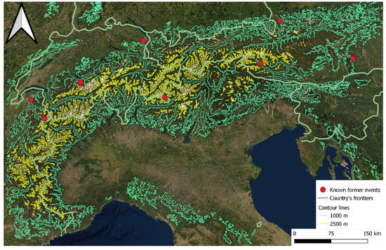 The European Alps encompass parts of France, Switzerland, Italy, Germany, and Austria. Rainfall on an existing snowpack is especially common in an altitude range between 1000 and 2500 m [3]. Including a selection of known hazard events described in Section 2. ESRI Satellite Image and EuroGeographics for the administrative boundaries.
