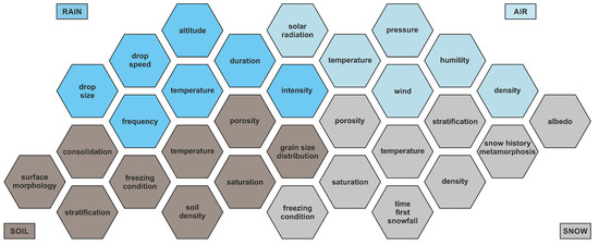 Compilation of varying conditions and properties of rain, snow, soil, and air affecting possible responses of the dynamic system.