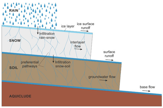 Schematic illustration of the four relevant layers: rain, snowpack with possible ice layer, soil, and aquiclude. Resulting processes from infiltration, melting, runoff, and flow are indicated by arrows. Branched lines in the snow and soil layer show preferential flowpaths.