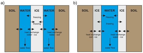 It is well-known that freezing in soil has similarities to soil drying and to the respective equations [52]. The Clausius–Clapeyron equation describes the relationship between pressure and temperature in freezing/thawing soils under equilibrium conditions between the liquid and frozen water [53]. While thermal equilibrium between ice and liquid water has so far always be assumed, modifications of the Clausius–Clapeyron equations to account for pressure differences between phases have been formulated [54]. The Clausius–Clapeyron equation is able to reproduce the important experimental observations of water flowing towards the freezing front causing as well as a depression in the freezing point in the porous matrix [52,55]. The ice content can be empirically related to the hydraulic conductivity using an impedance factor [56]. It should be noted that, for simplicity, most theoretical approaches neglect the density difference between liquid and frozen water, which is often associated with frost heave and would affect the pressure in the pores. In addition to its various mathematical forms, the Clausius–Clapeyron equation does not provide any microscopic information, such as a separation between micro- and macropores or similar [57]. Using a capillary bundle model, ice in a pore can be represented by a cylindric body with water flow around it (Figure 4a) [58]. The size of the cylinder and the surrounding liquid water layer can be calculated based on the counteraction of van der Waals forces at the pore walls and the Gibbs–Thomson effect [59]. However, from experimental observations, it is known that in macropores, water freezes at the walls first and grows towards the inner circle of the capillary tube (Figure 4b) [60].