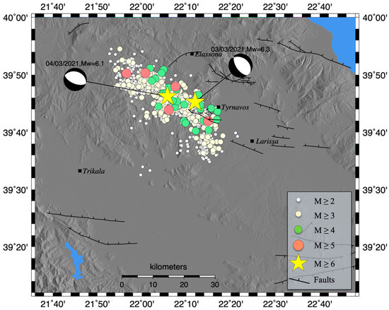 On 3 March 2021, an MW6.3 earthquake occurred in northern Thessaly (Central Greece), close to the cities of Tyrnavos, Elassona and Larisa (Figure 1). The earthquake occurred in a region that is one of the most seismically active in Greece, mainly characterized by normal faulting along NW–SE striking faults, which belong to the Thessaly fault zone [1,2,3,4,5,6,7,8,9,10]. Based on the provided focal plane solutions [11], the mainshock was generated by the activation of an NW–SE striking normal fault (Figure 1) [12]. The mainshock was widely felt in the Thessaly basin and in the surrounding areas, from Athens in the south to the northern borders of Greece.