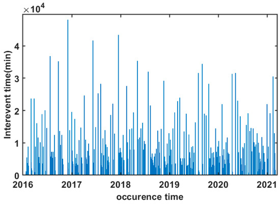 Interevent times between two successive events versus occurrence time of each event for a radius R = 80 km around the epicenter and a magnitude threshold, Mth = 2.0.