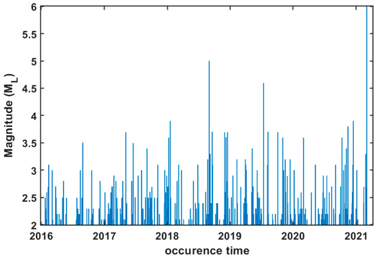 where N is the number of wavelet coefficients at a given scale m and the brackets indicate the average among the coefficients at a scale m. Figure 3 presents the interevent times between two successive events versus the occurrence time of the second event until the major seismic event, in a region within a circle of radius, R = 80 km, around the epicenter and a magnitude threshold, Mth = 2.0. The time period that was covered for MRWA of interevent times spanned from January 2016 until 3 March 2021, when the main event of Mw6.3 occurred. In Figure 4 the time– earthquake magnitude plot for a radius R = 80 km around the epicenter and a magnitude threshold, Mth = 2.0 is presented.
