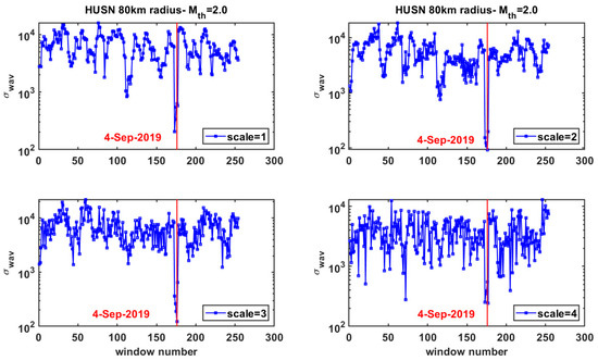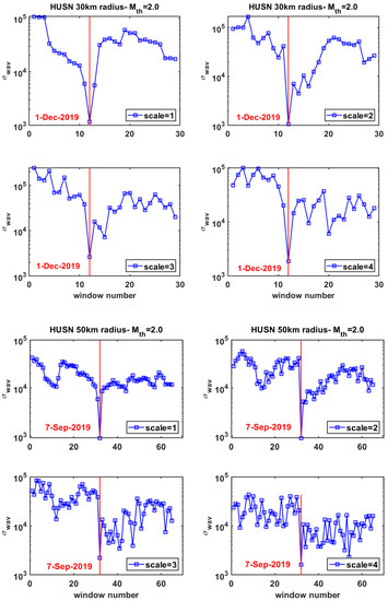 An initial comment from Figure 5 is the significant temporal variability in the strength of the multiscale properties of the interevent times. As observed in previous studies [26,27], before the major event of the seismic sequence a traceable decrease in the temporal evolution of the σwav, m(t) appeared, especially at lower scales. Plots at Figure 5 dictate the search for a time marker beginning several months before the major event for all the scales analyzed. The sharp decrease at lower scales (m = 1 and m = 2), which is observed before the major event, can be qualified as such a time marker since the decrease is evident for several days and is clearly identifiable.