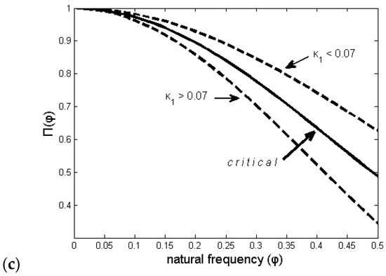 It has been shown that the properties of Π(ω) at ω → 0, i.e., the values of κ1 = 0.07, can signify the approach of a complex system towards some critical point [35], such as that of an impending large earthquake (see [24,31,37] and references therein). Figure 6 shows an earthquake timeseries in conventional (Figure 6a) and natural time (Figure 6b) domains. Figure 6c shows the corresponding power spectrum Π(ω) for the critical stage with κ1 = 0.070, based on Equation (6), while the two other curves are for non-critical stages. Theoretically, it has been shown that κ1 approaches 0.083 as N → ∞, when there are no long-ranged correlations in the system [35].