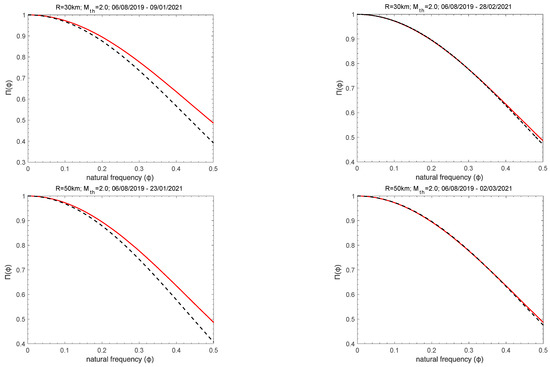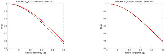 Time evolution of Π(ϕ), for 0 ≤ ϕ ≤ 0.5, of the seismic activity, for Mth ≥ 2.0 and R = 30 km (top), R = 50 km (middle), and R = 80 km (bottom), when calculations start on 6 August 2019 for R = 30 km and R = 50 km and on 7 November 2019 for R = 80 km. Π(ϕ) curves (dashed lines) fall on the theoretical Π(ϕ) curve (red solid lines), calculated from Equation (6), as the critical stage is approached.