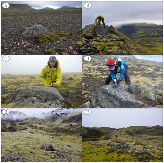 Photographs showing selected sample locations. (A) JM2015-11, erratic boulder on till, Midt-Jan. (B) JM2018-74, lava, tindar on Sør-Jan. (C) JM2015-08, striated erratic boulder on till, Nord-Jan. (D) JM2015-01, erratic boulder on Nord-Jan. A battery-powered rock saw was used for sampling. (E) JM2018-113, lava flow. (F) Thin layer with plant material overlying a lava flow.