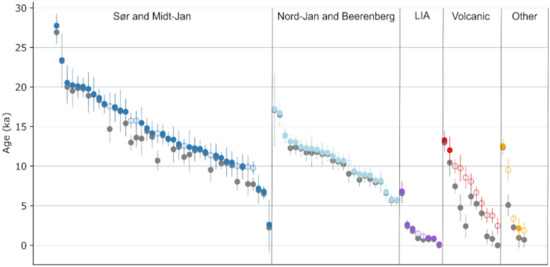 The erosion rate will affect the 36Cl exposure ages but is unmeasured on Jan Mayen. As an estimate, we therefore used an erosion rate of 1 ± 0.5 mm/ky, similar to what has previously been used in Iceland (1.11 mm/ky [39]). Changing the estimated erosion rates to either 0 ± 0 mm/ky or 2 ± 0.5 mm/ky changes the calculated ages by, on average, less than 1%. If a substantially higher erosion rate is used, e.g., 5 mm/ky, there is an average change of ~2%, although for a small number of samples, the effect is more pronounced (5 samples changed 5–7%).