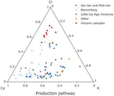 Proportions of cosmogenic 36Cl attributed to the three major production pathways (K, Ca, and Cl) varies substantially between the samples (Figure 6). Samples with a higher proportion of production from the Cl pathway are more likely to be affected by the formation age assumption. The range of possible scenarios surrounding the background production is discussed in detail later.