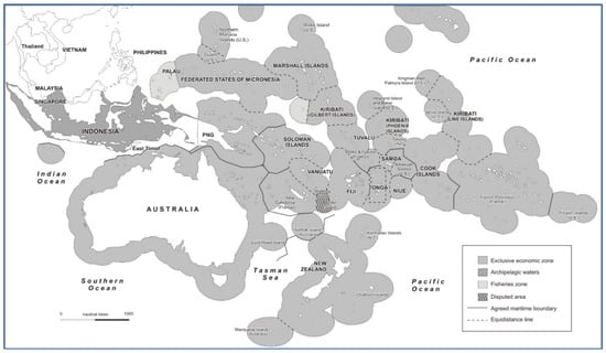 Taken altogether, the Pacific Island States total just over 550,000 km2 of land (with Papua New Guinea comprising 84 per cent of this area). These islands are scattered over the vast 165 million km2 Pacific Ocean, which encompasses around one third of the surface of the earth [,]. The remote location of the Pacific Island States from their maritime neighbors means that they have enormous claims to maritime jurisdiction, encompassing an estimated area of 30,569,000 km2 (approximately equivalent to the land area of the African continent) [] (pp. 144–157).